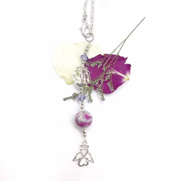 *One beautiful handmade flower petal bead is paired with a clear crystal sun catcher bead, sparkling crystals and accented with a silver plated angel charm (or another charms of your choice).