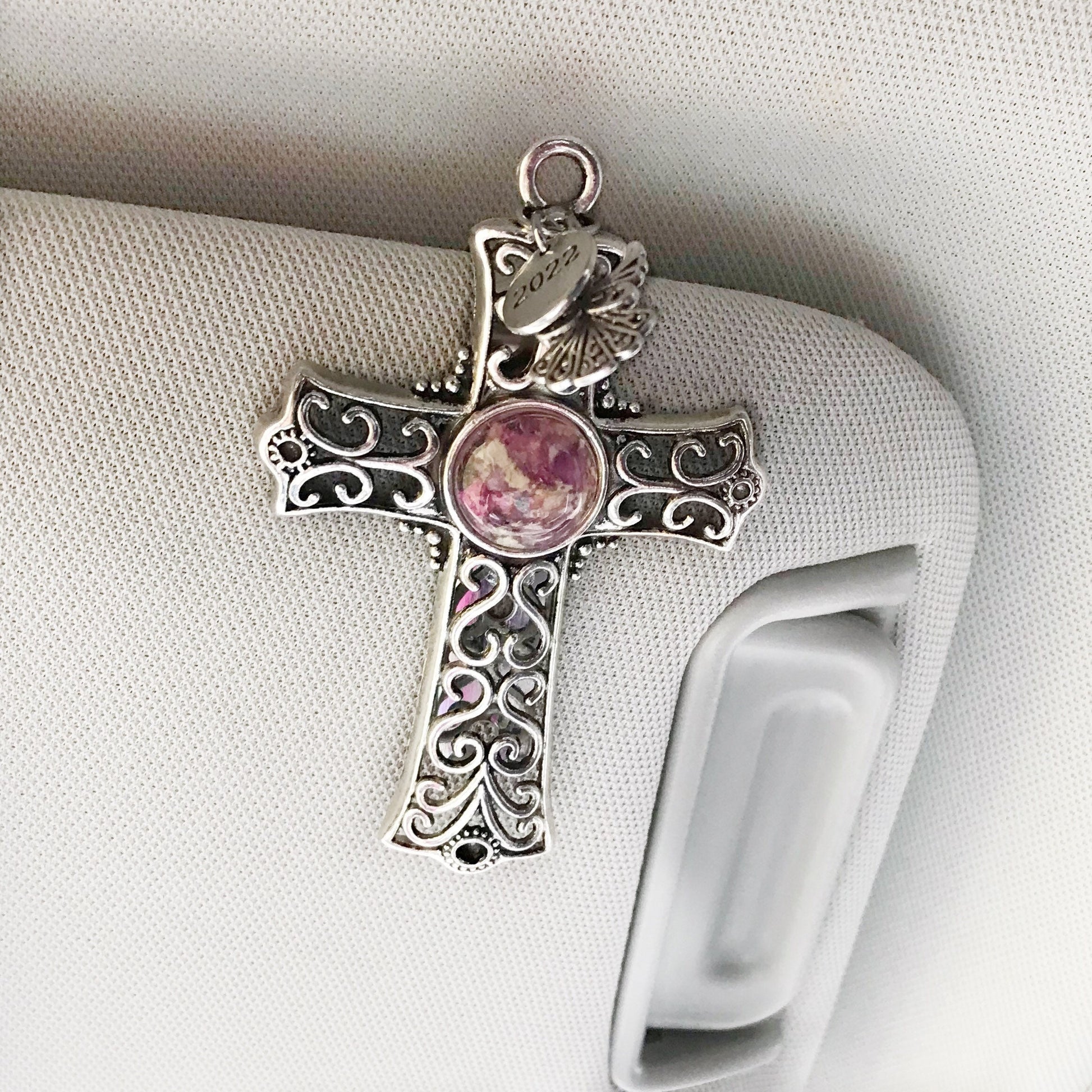 *Cross attached to a metal clip, recommend using care when handling and placing on your cars visor.